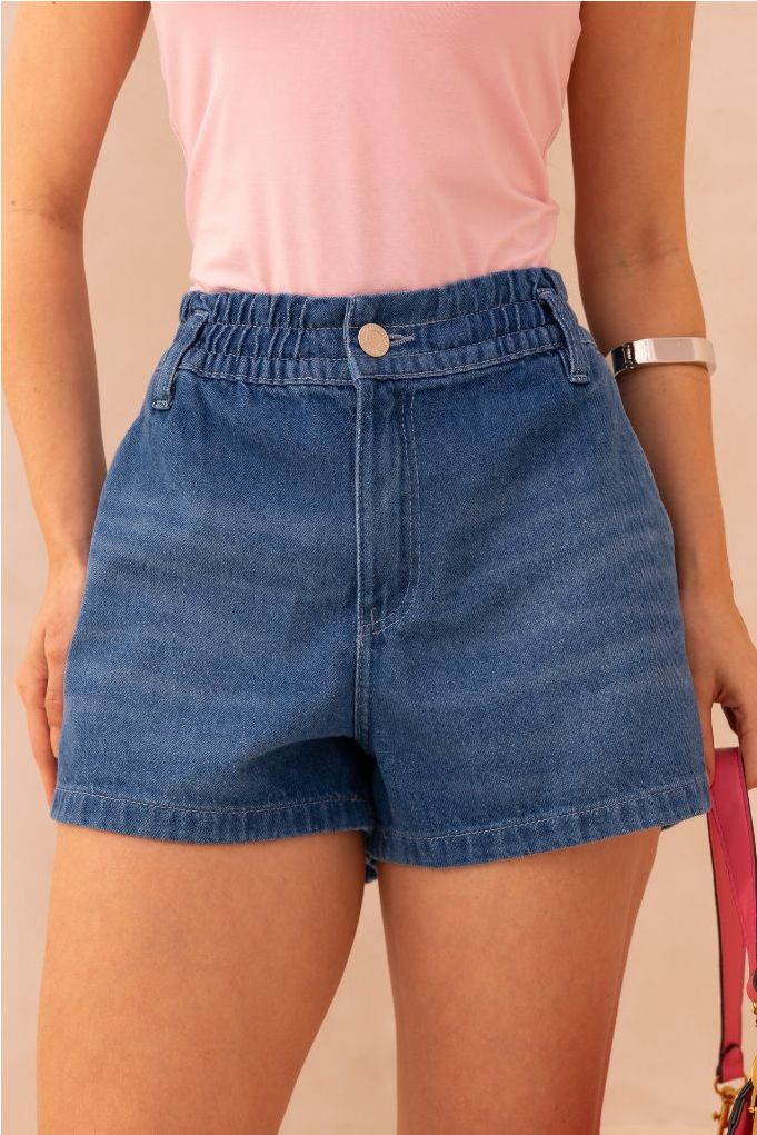 O Shorts Jeans Cintura Alta Com Elástico Feminino Revanche Mázaca combina conforto e estilo em uma peça moderna e versátil. Confeccionado em jeans macio e resistente, o modelo possui cintura alta com cós elástico, que garante ajuste perfeito ao corpo e liberdade de movimento.